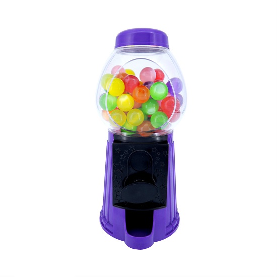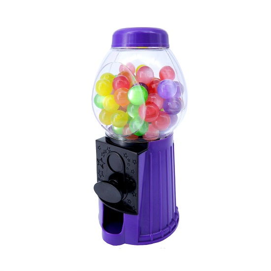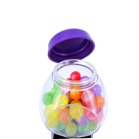 The pictured candy vending machine has a clear globe shaped container on top and is covered with a lid. It has a turning knob for dispensing candy and offers convenient access to the candies inside. This candy vending machine is easy to refill and is excellent for candy, gumball and capsule use.