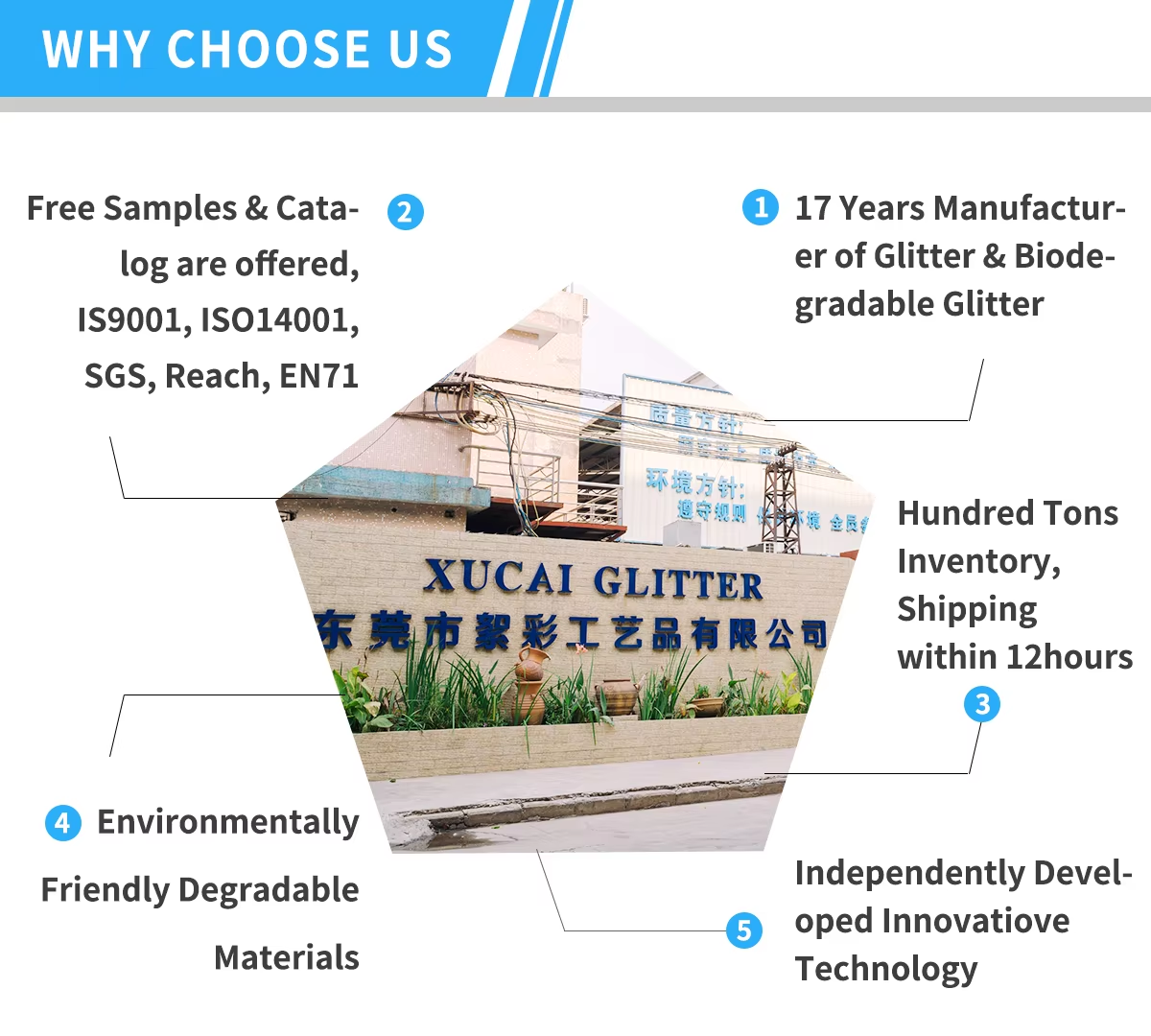 Xucai glitter powder is widely used in ink coatings, nail and makeup, glass craftsmanship, shoe material craftsmanship, Christmas ornaments, clothing printing, building materials decoration, paper printing, plastic products, electronic products and other fields. The product has the characteristics of high temperature resistance, solvent resistance, acid and alkali resistance, and injection molding capability. With unique visual effects and high flash characteristics, the product's colors are bright and eye-catching.