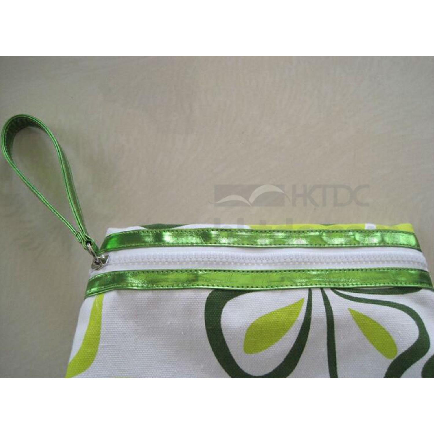 1.Material: 1C canvas material+silk printing flower pattern on both sides+PU leather zipper pull+stitching closed edge