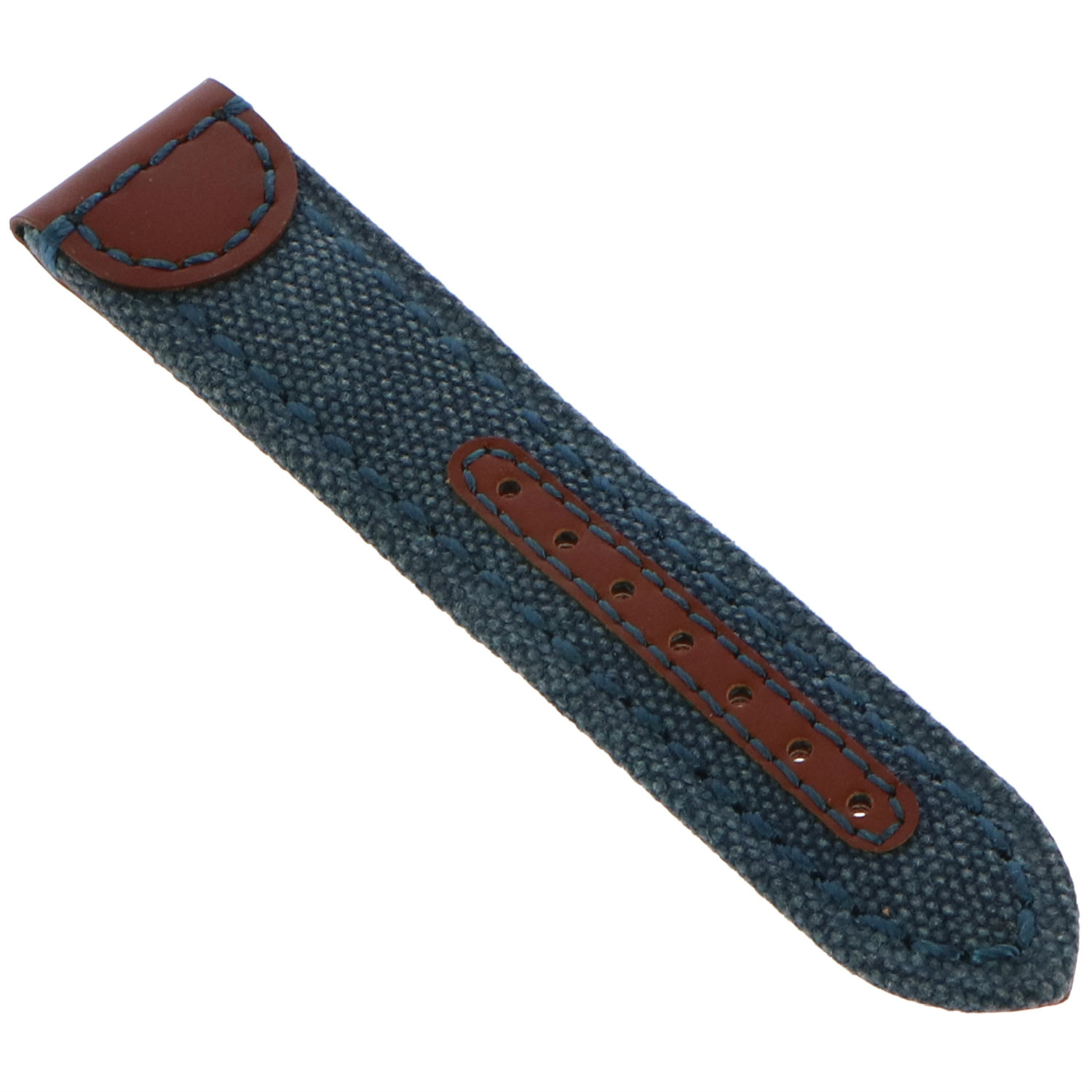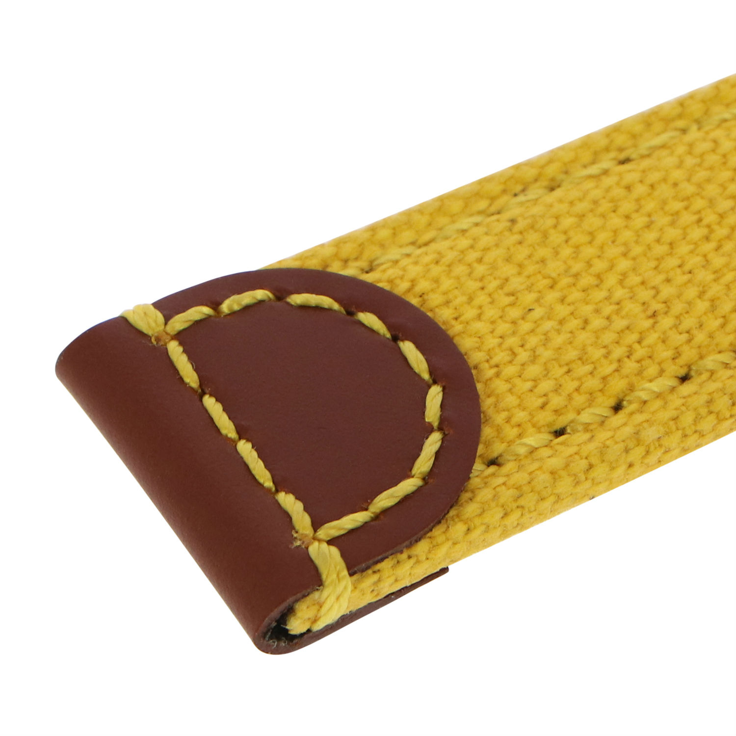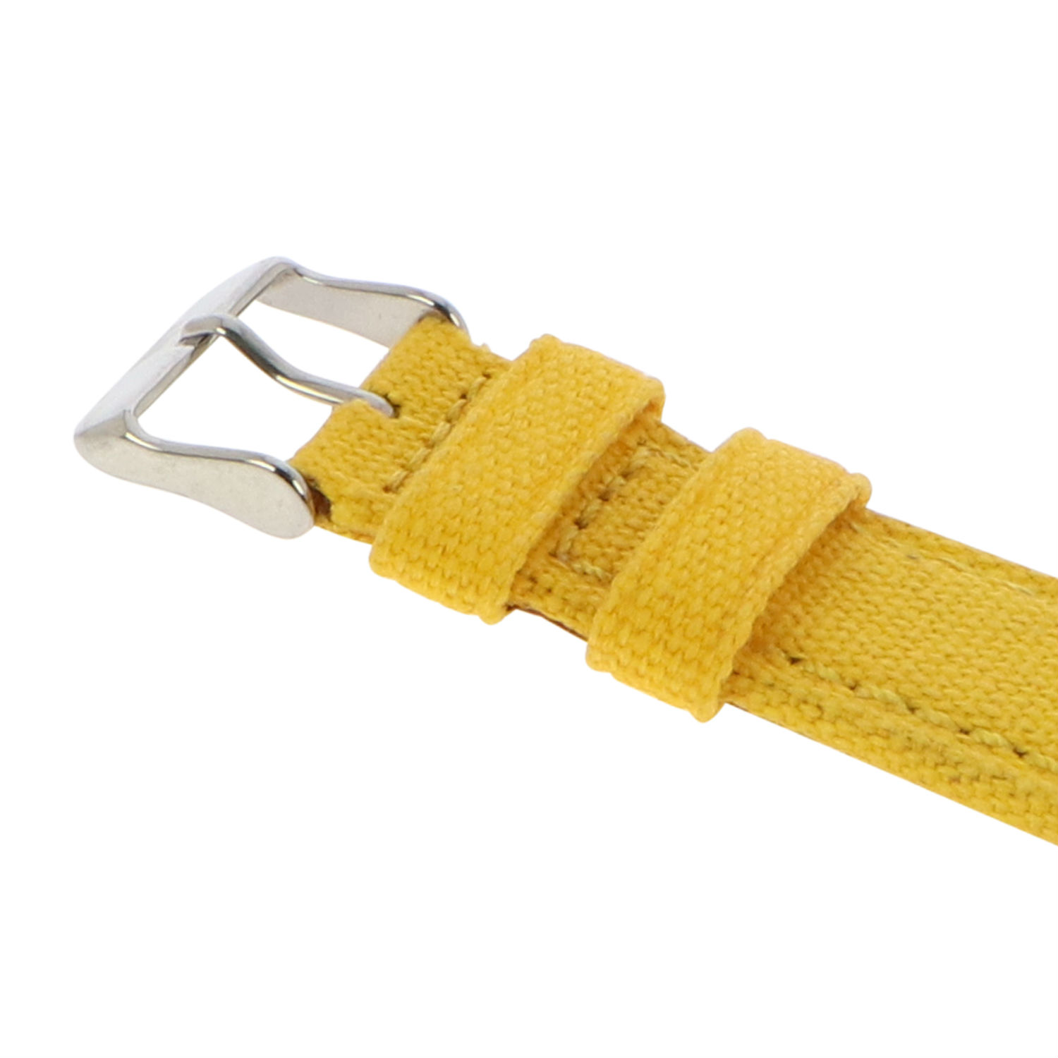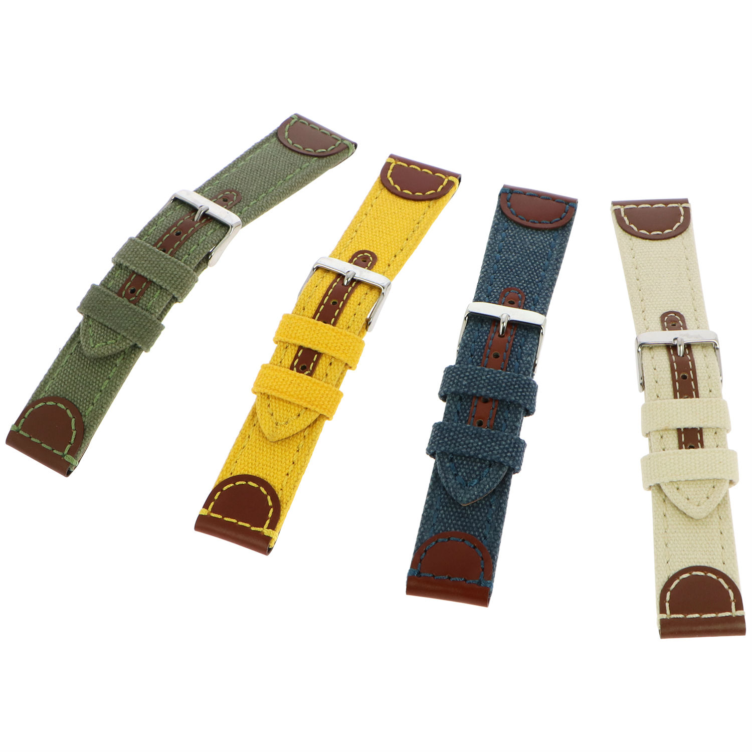 This watch strap is made of canvas and is embellished with stitched patches of oily cowhide in matching color of the canvas. It comes in a simple and durable design and has a polished stainless steel buckle for fastening. The canvas watch strap is easy to install and can provide a comfortable and adjustable fit.