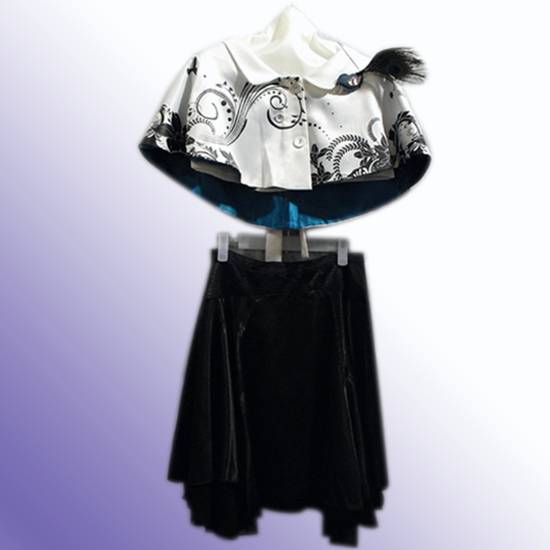 This adorable set comes with a cropped cape and a contrasting black skirt. The white cape is accented with abstract floral patterns and a bird brooch with feather trimming. The skirt has a high-low hem for a more dynamic look.