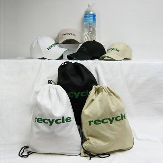 These caps and shoe bags are centered around the theme recycle. The caps are ideal for outdoor and sports activities. The caps can effectively shield you from the scorching sunlight. The shoe bags allow you to contain and carry your shoes easily.
