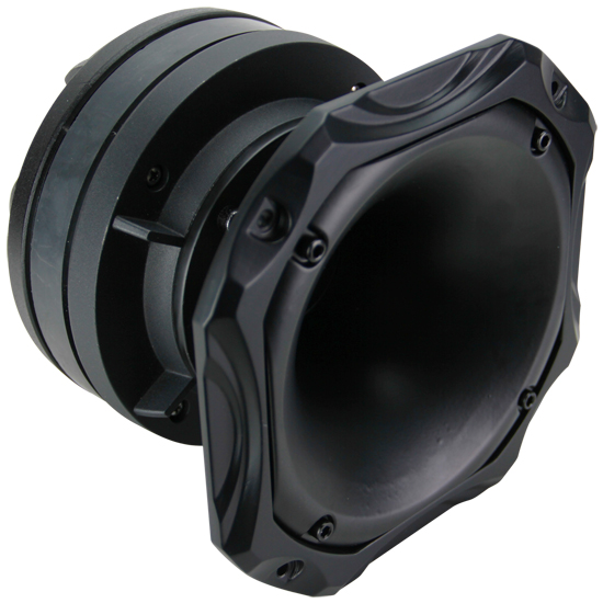 Corn-shaped horn tweeter with a square rim.