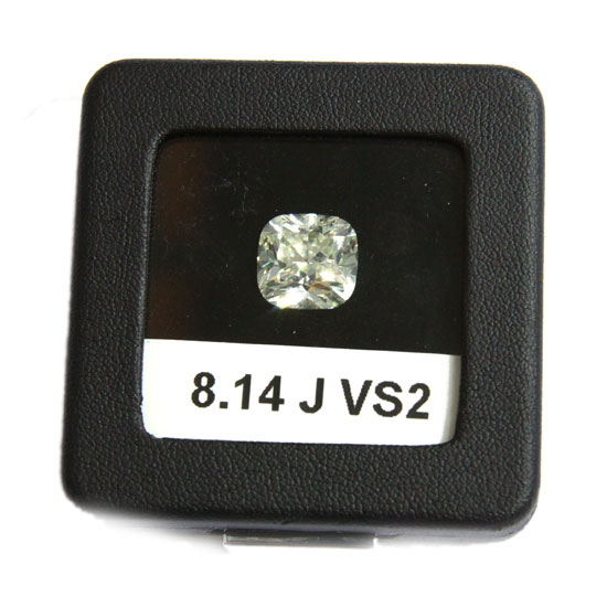 This glamorous cushion-cut diamond has the total diamond weight of 8.14 carats. It is masterfully polished by experience craftsmen, presenting a brilliant shine. This sparkling carat diamond will surely add a sophisticated accent to your jewelry.