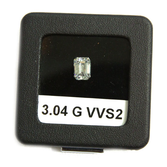 This outstanding carat diamond weighs 3.04 carats, with the clarity of VVS 2. The emerald-cut design reflects a brilliant shine. This 3.04-carat diamond goes great with your jewelry, including rings, necklaces and bracelets.