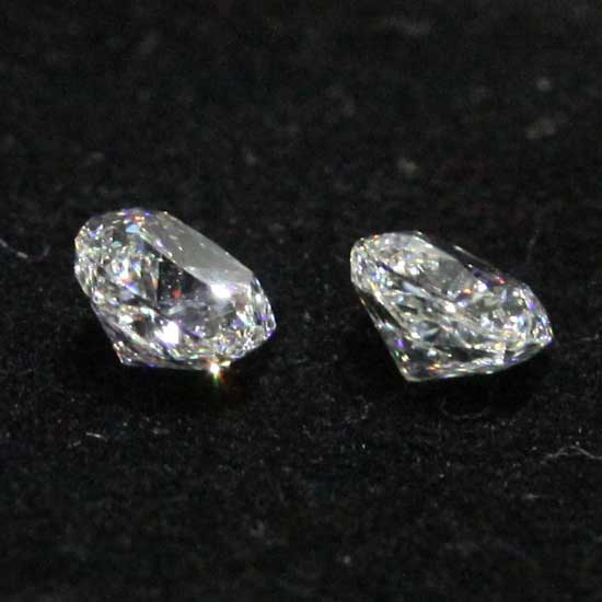 Shown here are two precious diamonds boasting a highly clear construction. The diamonds are cut in a delicate cushion shape. The enchanting sparkles brighten jewelry of any designs.