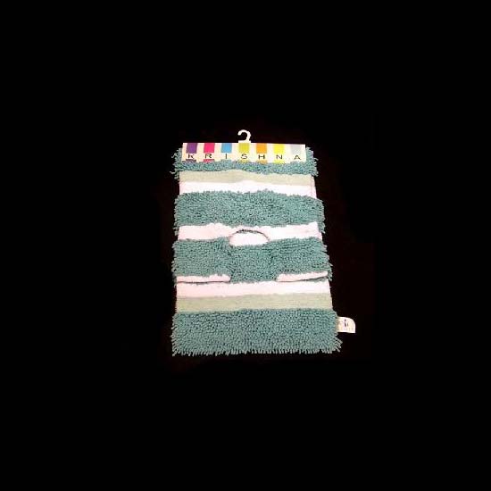This is a bathroom carpet with green, white and brown stripes pattern