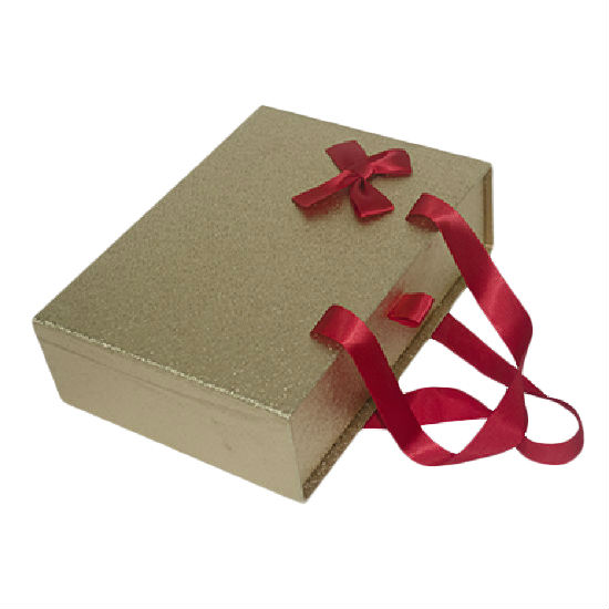 This carton box features a lovely and elegant design. It is rectangular shaped and has a gold toned exterior adorned with a ribbon box. The carrying handles of this box also comes in ribbon style for a matching look.