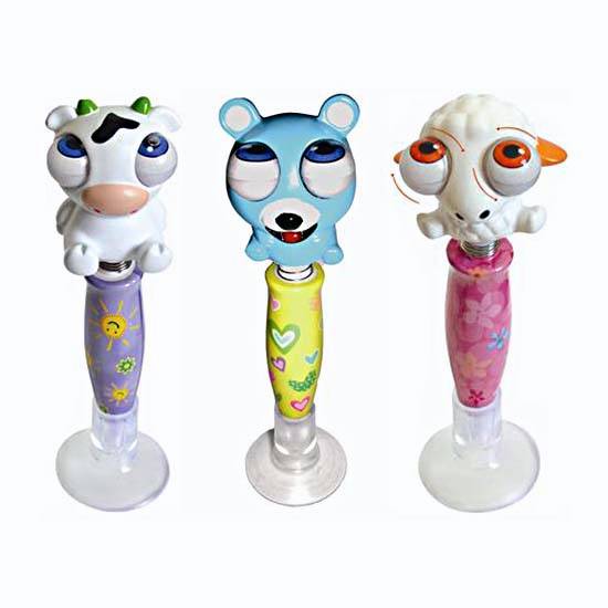 This is a stretchy ball pen featuring a design of cartoon animals. The ball pen is plugged on a sucker to stand on desks. The base of the animal is attached with a spring. The animal is able to shake while you are writing with the pen. This item is a perfect gift item for young boys and girls.