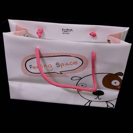 This cartoon paper bag comes with images of an attractive cartoon dog printed on both sides. It is made of laminated paper to enhance waterproof ability and durability. This glossy paper bag is reusable and environmentally friendly.