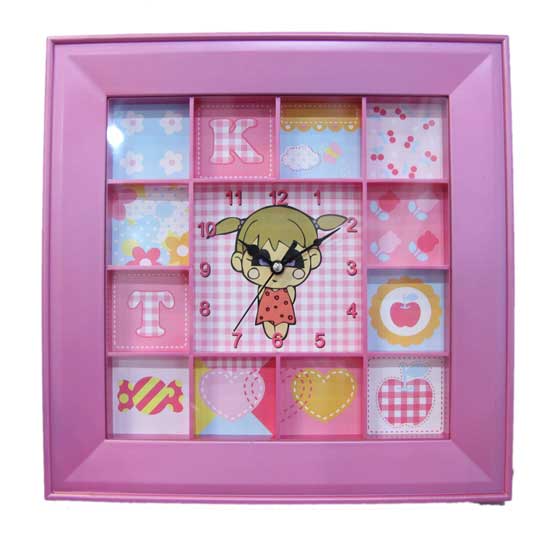 This cartoon wall clock features a square pink case with a clear protective lens. The colorful dial is divided into 12 small checks with a cute cartoon girl motif in the center. Enhance your kids' room decor with this lovely wall clock.