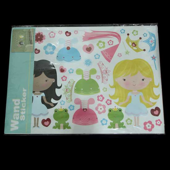 The picture showcases a cute wall sticker set with colorful cartoon patterns like girls, evening dresses, frogs and flowers. The stickers are easy to apply and remove without leaving any residue. Decorate your walls, bed posts, refrigerator, windows, store fronts, doors, and more with these stylish sticker.