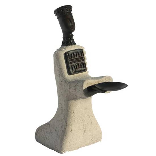 The picture shows a casted volcanic stone carving for decorating your home, garden, shop and office. The stone handicraft features an African priest holding a round plate in his hand which shows an ethnic and artisitc style.