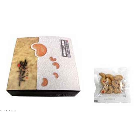 Featured is a box of cashew snack made in Japan. The cashew nuts are fried so that they offer a crispy texture. The nuts feature an appetizing flavor and they are perfect for serving with beer.