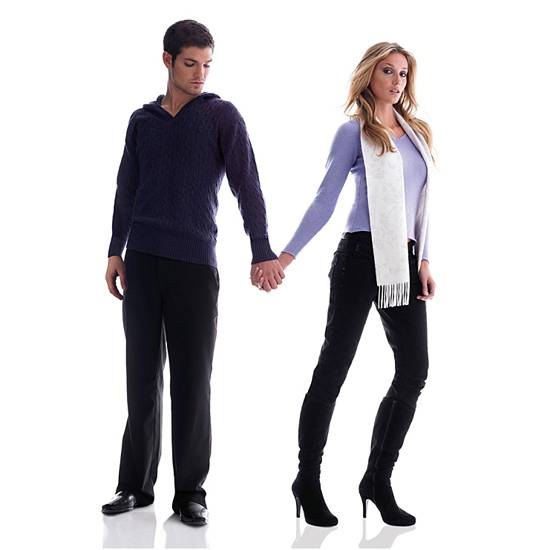 On her is a gauzy V-neck sweater in violet and a scarf with butterfly and floral motifs
