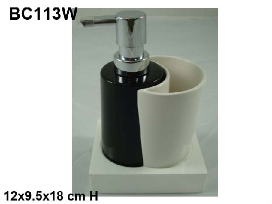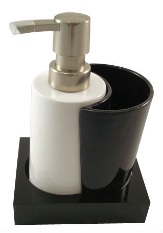 Set of 3 pieces ceramic bath set (soap dispenser, tumbler) with plastic pump in chromed and acrylic holder in black.