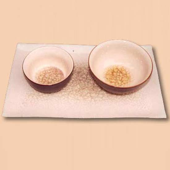 This ceramic bowl set comes with two bowls in different sizes and a rectangular serving tray. The items share a uniform design, with decorative visible cracks on the interior. The ceramic bowls make aesthetic tableware items.