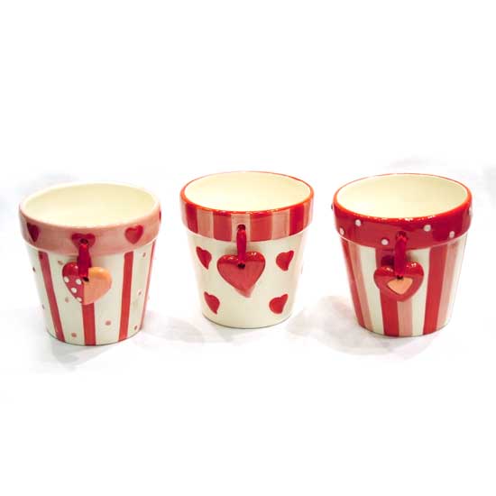 This is a collection of ceramic cups in a two-tone style. The red vertical striped print is added for a decorative touch. Adorned with sweetheart-shaped ornament, the charming cup is a great gift for Valentine's Day.