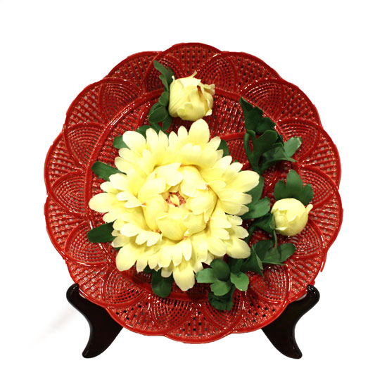 Displayed is a decorative plate with a blossoming flower at the center. The delicate cut-out details on the plate add a touch of style for the plate. The whole design exudes an oriental vibe to freeze attention.