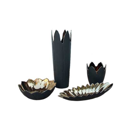 The Kadupul vase family boasts an elegant and artistic design. This collection appeals to people with its noble and amazing touch instantly. Each piece features a golden interior and a black exterior.