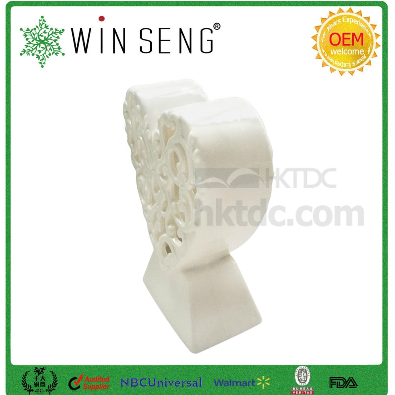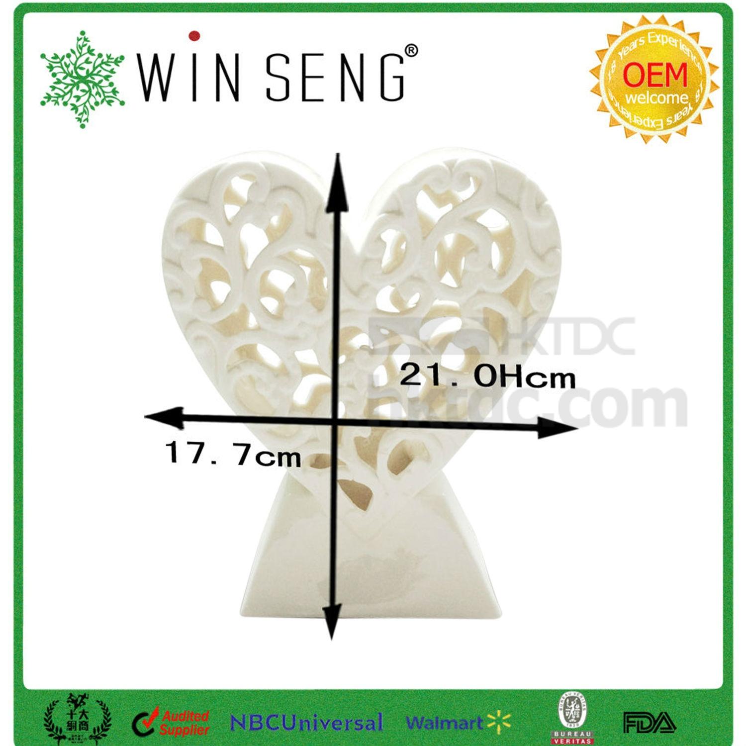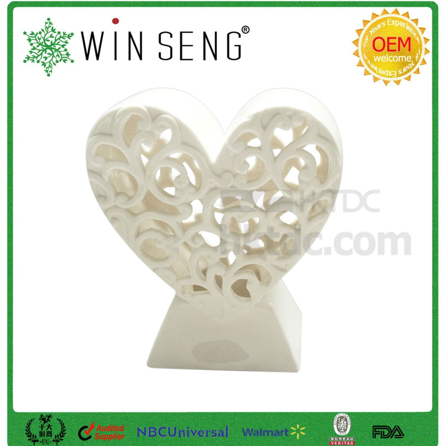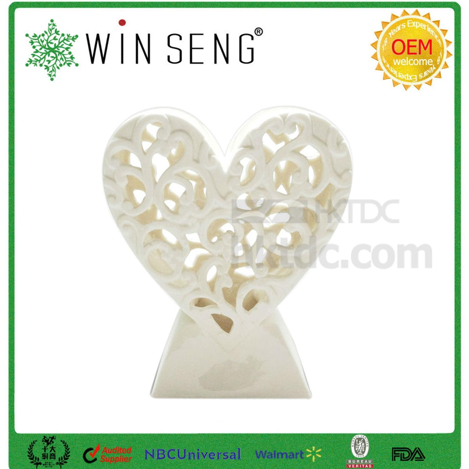 Salvage boring home decors with this ceramic heart-shaped decoration supported with a trapezium base. Meticulously crafted and ground with impressive swirl cutouts, the openwork facets in the front and at the back simply turn the decoration into a piece of art. Finished in natural, even colors with a bit of distressed details, this decoration suits vintage homes perfectly well.
