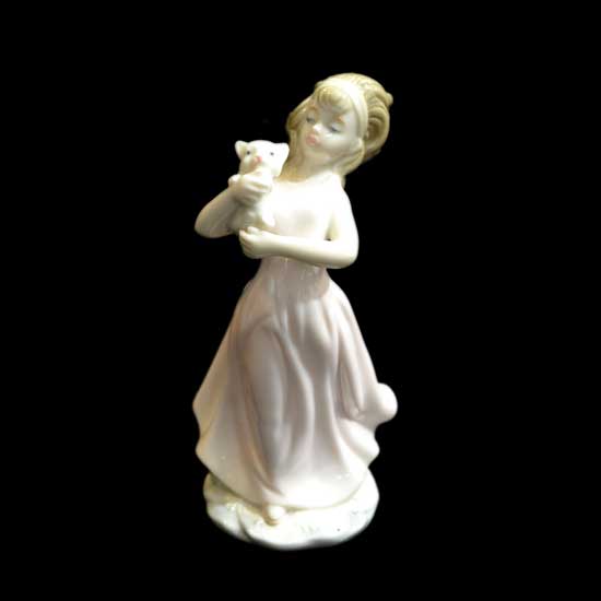 Displayed is a lovely ceramic doll for decoration purposes. The young lady holds a pet close to her chest with a cheerful smile. This ceramic doll can be placed anywhere in your room of your preference.