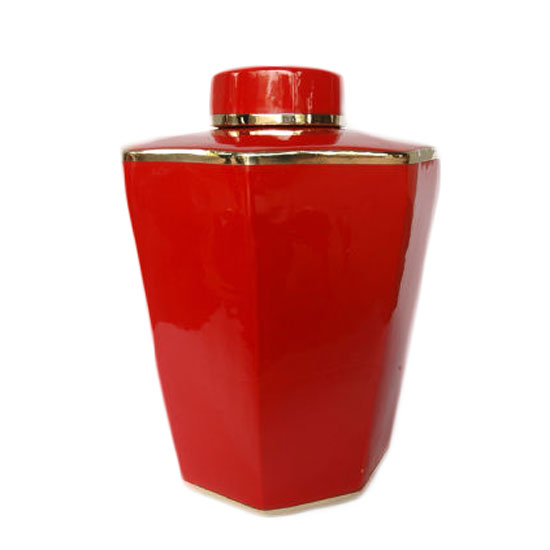 This is a 100% handmade ceramic jar in bright red. The golden accents add a sense of charm to this jar. This item is a great decoration for your home for enhanced elegance.