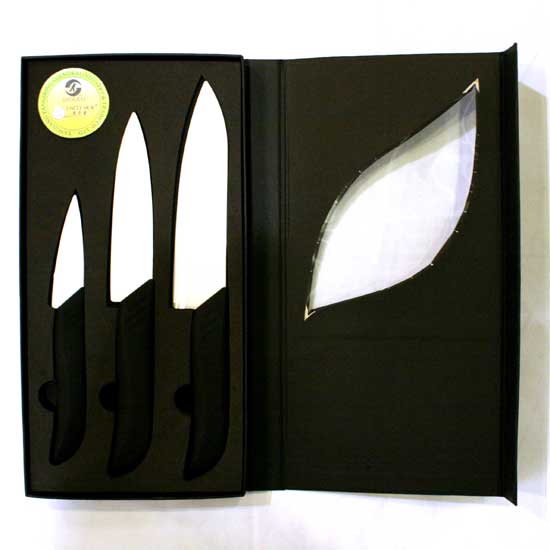 The ceramic knife set delivers exceptional hardness and sharpness. The ergonomic handle with a TPR coating provides a comfortable grip. This ceramic knife set is perfect for slicing fruit, vegetables and meat.