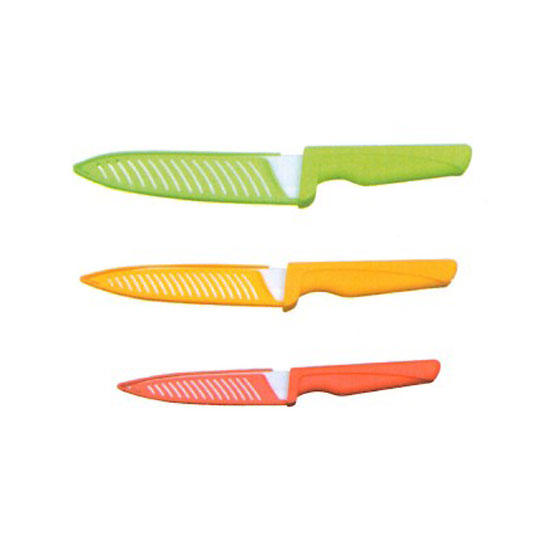 This is a knife set with a 6" chef knife, a 5" slicing knife and a 4" utility knife. It is made of quality ceramic for a long service life. This ceramic knife set is designed in bright colors for an eye-catching look.