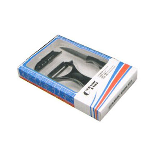 This is a knife set with a 3" mini knife, a knife sheath and a peeler. It is made of quality ceramic for a long service life. This ceramic knife set is finely packed in a box with a window display.