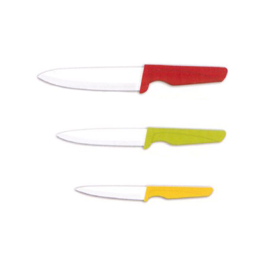 This is a knife set with a 6" chef knife, a 5" slicing knife and a 4" utility knife. It is made of quality ceramic for a long service life. This ceramic knife set is designed in bright colors for an attractive look.