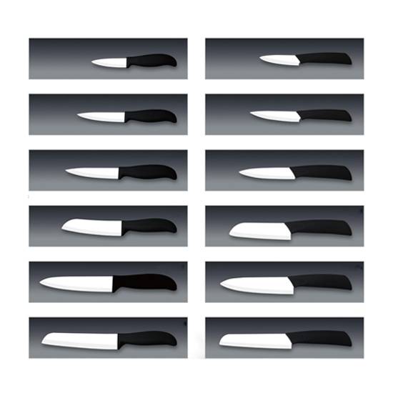 These are ceramic kitchens knives of a massive variety of sizes, as to serve customer needs. Sizes range from small chopping knives to large meat cleavers and carving knives. Each knife is fitted with a synthetic plastic handle that prevents slippage and has a firm ergonomic grip design.