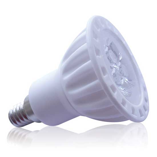 Displayed is an LED light bulb sporting a high-power design. It is made out of quality ceramic material for reliability. This piece can operate with different bases, including the E14, E27, GU10 and MR16.
