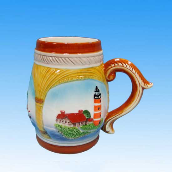 The displayed ceramic mug with a protruding belly features alluring patterns of a house near a lake. The curving handle design adds an extra style to the look. This distinctive ceramic mug is made of dolomite which is safe to use and not harmful to the environment.