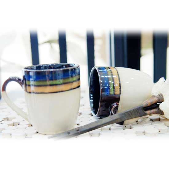 This highlighted ceramic mug comes with a D-shaped handle, allowing easy holding. The rim is accented with three warm-toned stripes for added style. This displayed drinking mug is great for home and office use.