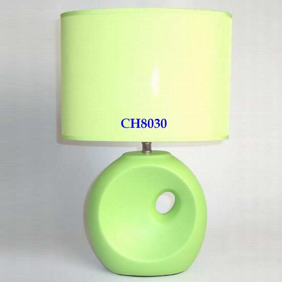 This ceramic lamp features a fancy design. The round base comes with an oval switch. The lampshade goes with a drum shape, highlighting a fluorescent-green complexion. The colored shade creates a vibrant hue to the room.