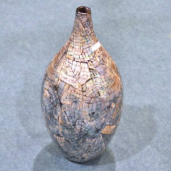 The featured item is a vase made from ceramic. It comes with a large base bottom and and a very narrow opening. The ceramic surface of the vase is also decorated with mother of pearls in checked style.