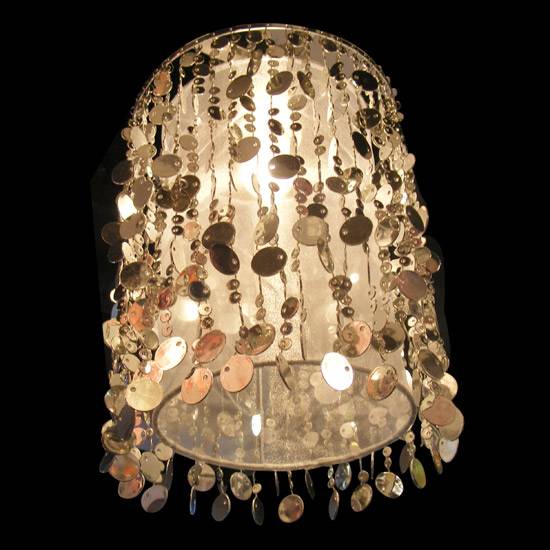 This is a silvery coloured chandelier decorated with shinny circular mirror pieces of various sizes. The chandelier is cylindrical in shape. The chandelier has a reflexive and shinny appearance.