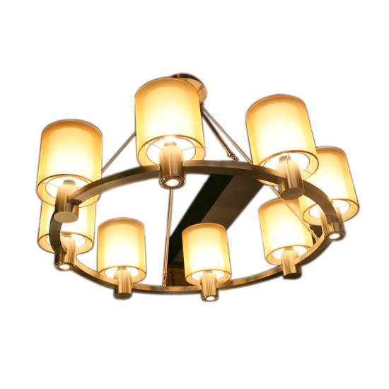 This is a chandelier with eight light shades with bulbs. These shades are attached on the circle base. A simple but with contemporary design.