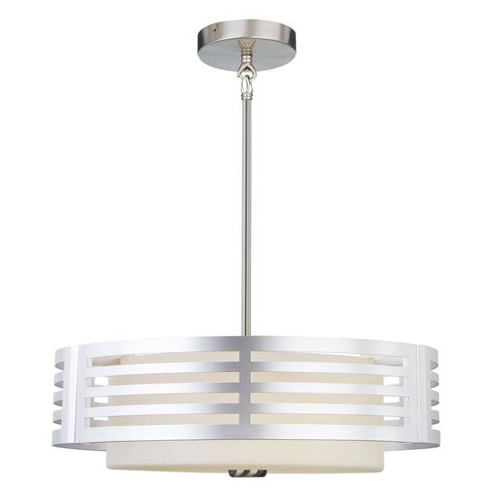 This chandelier looks modern, which certainly creates a stylish outlook in your living room. It is strongly held by a vertical bar, which carries the whole lamp from the ceiling. The lamp itself is in a somewhat circular shape, with a silver frame surrounding it. Four empty lines are found on the frame to let the lights more freely shine through the room.