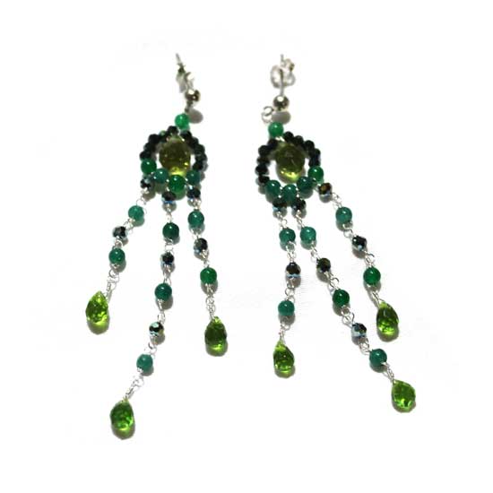 This pair of earrings features a chandelier-like design with alluring draping details. It is made of crystal, quartz and other semi-precious stones. This pair of earrings in green and black adds an attractive touch to your look easily.
