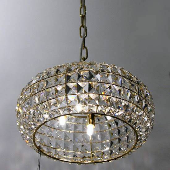 This is a crystal chandelier in a delicate design. It boasts a round metal shade encrusted with shimmering crystals, adding a touch of elegance to the entire design. This fancy chandelier lamp surely will bring an enchanting glow to your home.