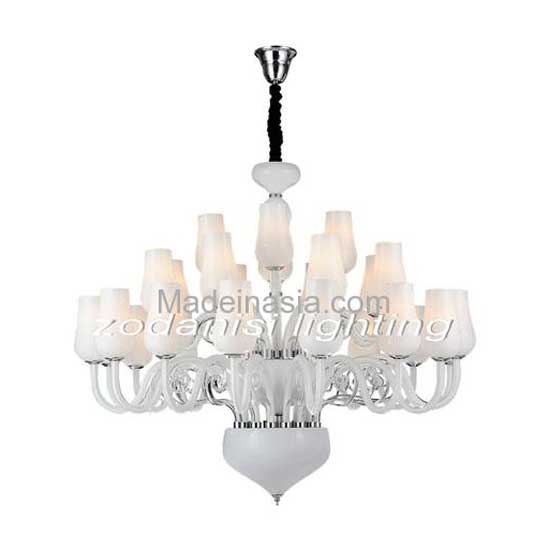 This is a stylish chandelier lamp with multiple heads. It features a sophisticated white structure with white lampshades. This lamp surely is a great lighting choice for your modern home.