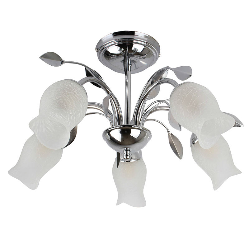 Chandelier with 5 lights and white glass shades. Suitable for indoor use.