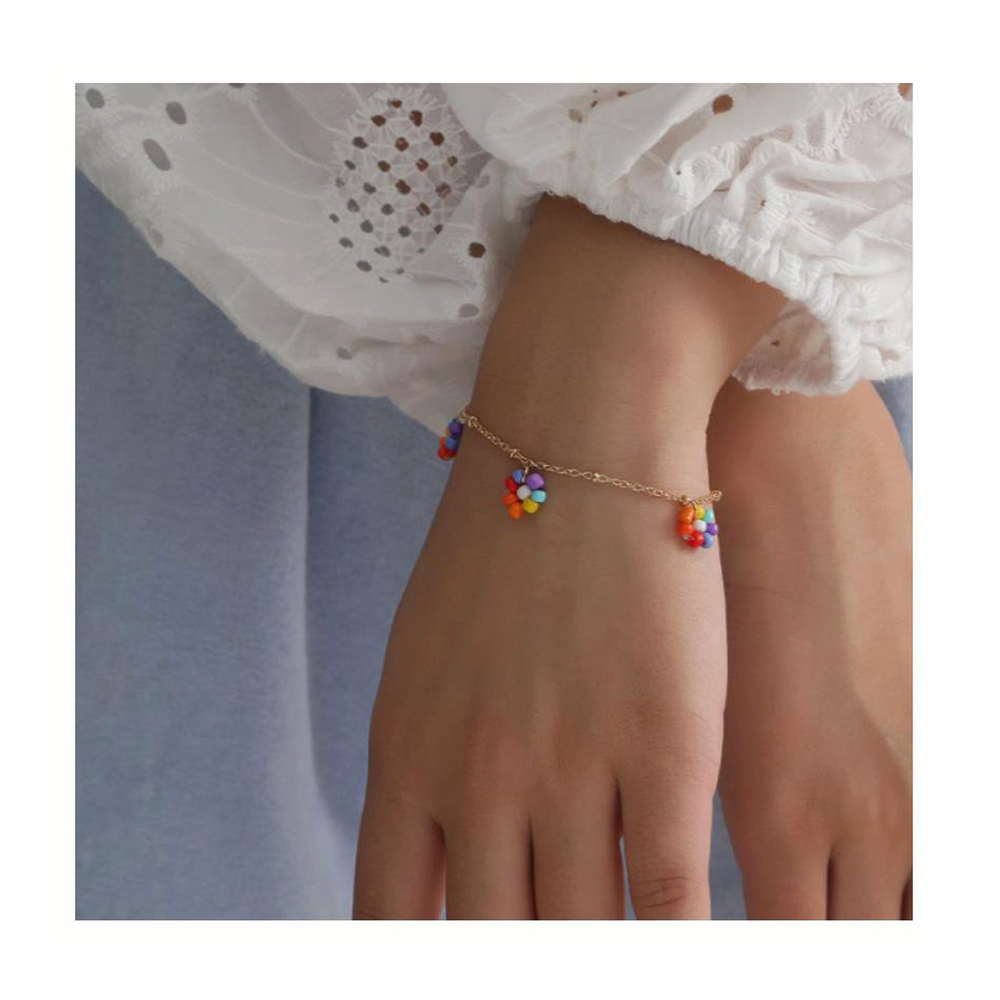 As shown is an elegant trendy plastic beads gold plated chain bracelet.