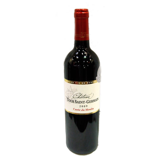 Presented here is a Merlot wine produced by Chateau Tour Saint-Germain. This French red wine shows a deep red color. The Chateau Tour Saint-Germain 2009 is ideal for pairing with chicken and grilled meat.