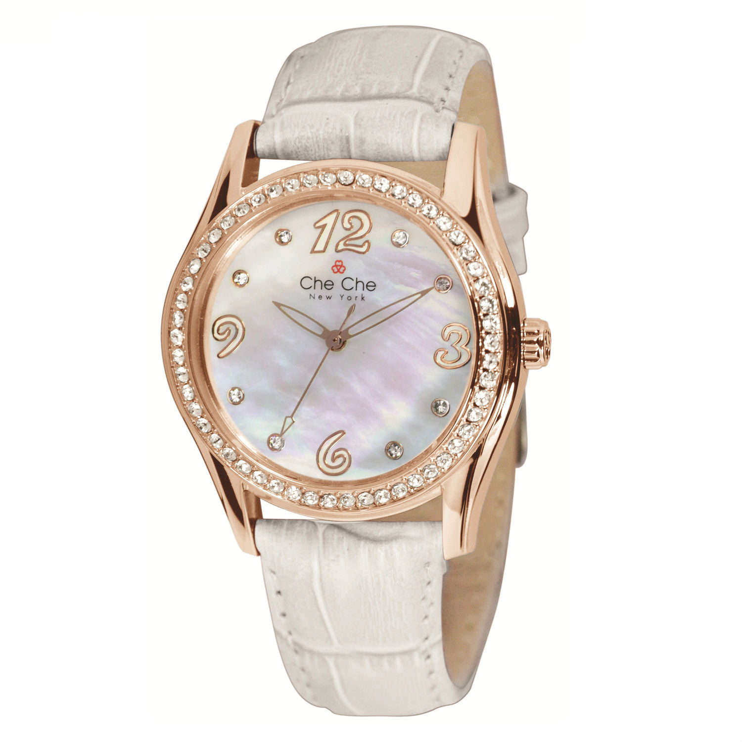 This Che Che New York Glorious Longing Series Watch appeals to a bunch of girls with its elegant design. It calls attention to those round Swarovski crystals paved along the rim, shining exceptional brilliance. Placed with a pearlescent MOP dial, the interior adds luster to the watch. Teamed with a pale genuine leather strap in alligator pattern, the accessory is a classy addition to your watch collection.