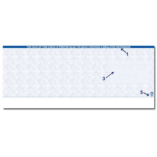 This sophisticated check paper provides advanced fraud and forgery prevention technologies, including relief printing in Courtesy Area Recognition (CAR) area, chemical sensitivity, invisible fluorescent fibers, and toner adherence. A warning band is located at the top of the check for enhanced security.