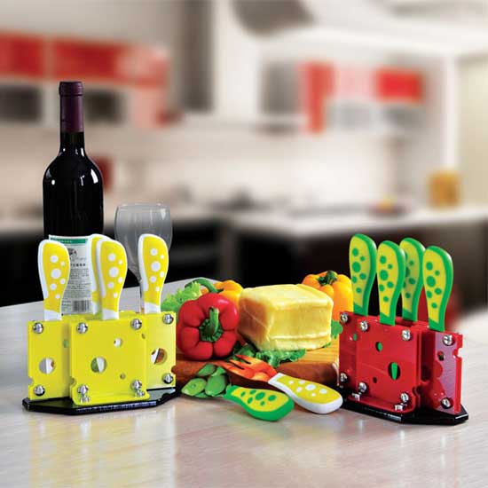 This four-piece cheese set includes two cheese cutter sets, a fork and a mini spatula. The cheese cutters come with stainless steel blades with PP and TPR handles. The cheese set boasts a colorful appearance to brighten up your mood.