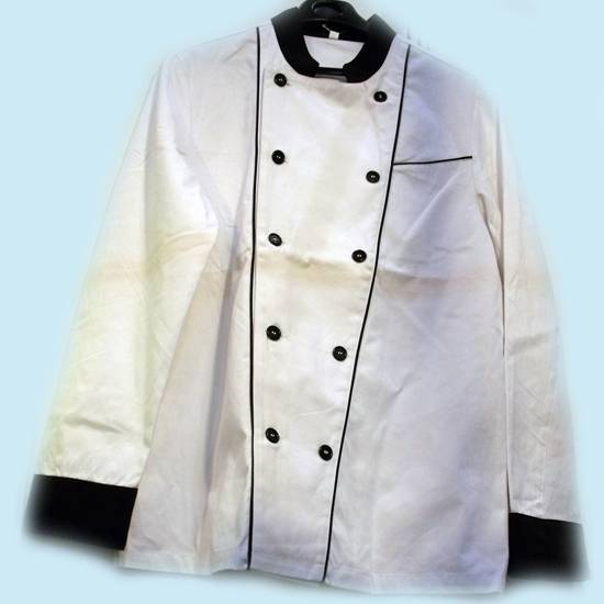 This chef shirt features two rolls of French-knob buttons, full-length sleeves and a breast pocket. The stand collar and cuffs in black enhance the professional look. The thin woven fabric is especially good for working in the kitchen.